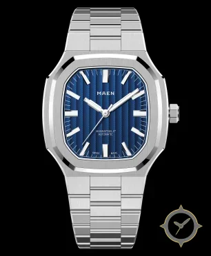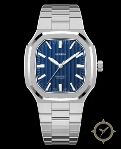 Eine Luxus-Uhr mit einem 37mm Gehäuse im Vintage-Stil gefertigt aus Edelstahl mit einem Zifferblatt in blau und einer besonderen "vertical ridged / guilloché"-Oberfläche.