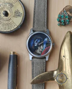 Eine Dress-Uhr mit einem 32mm Gehäuse im Vintage-Stil gefertigt aus Edelstahl mit einem Zifferblatt in blau und einer besonderen "hand-painted portrait artwork"-Oberfläche.
