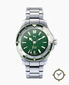 Eine Taucheruhr-Uhr mit einem markanten 42.5mm Auftritt am Handgelenk, gefertigt aus Edelstahl mit einem Zifferblatt in grün und einer besonderen "basket-weave / textured guilloché"-Oberfläche.
