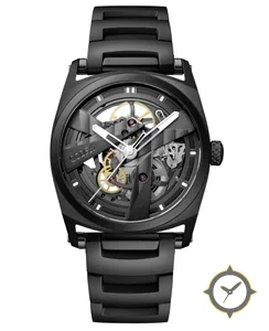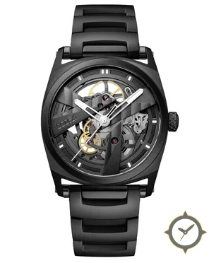 Eine Skelett-Uhr mit einem 36mm Gehäuse im Vintage-Stil gefertigt aus Beschichtung mit einem Zifferblatt in schwarz und einer besonderen "open-worked / skeleton"-Oberfläche.
