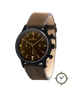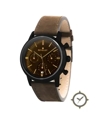 Eine Chronograph-Uhr mit einem 36.5mm Gehäuse im Vintage-Stil gefertigt aus Edelstahl mit einem Zifferblatt in braun und einer besonderen "sunburst"-Oberfläche.