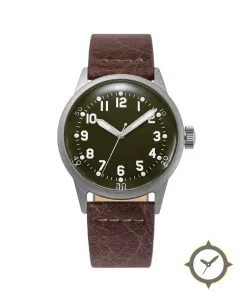 Eine Field-Uhr gefertigt aus Edelstahl mit einem Zifferblatt in grün und einer besonderen "matte"-Oberfläche.