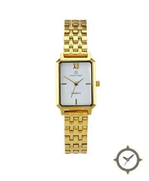 Eine Dress-Uhr mit einem 21.5mm Gehäuse im Vintage-Stil gefertigt aus Gold mit einem Zifferblatt in weiß und einer besonderen "subtle concentric guilloché texture"-Oberfläche.