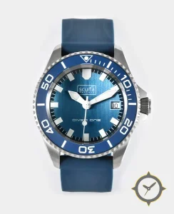 Eine Taucheruhr-Uhr mit einem markanten 42.5mm Auftritt am Handgelenk, gefertigt aus Edelstahl mit einem Zifferblatt in blau und einer besonderen "vertical brushed / sunburst"-Oberfläche.