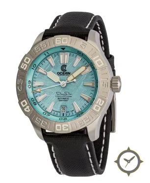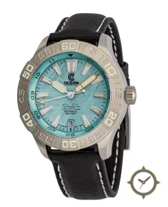 Eine Taucheruhr-Uhr mit einem vielseitigen 38mm Gehäuse, das an fast jedes Handgelenk passt, gefertigt aus Edelstahl mit einem Zifferblatt in türkis und einer besonderen "meteorite-like textured finish (frosted/ice pattern)"-Oberfläche.