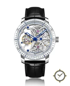 Eine Skelett-Uhr mit einem vielseitigen 38.5mm Gehäuse, das an fast jedes Handgelenk passt, gefertigt aus Edelstahl mit einem Zifferblatt in silber und einer besonderen "open-worked / skeleton"-Oberfläche.