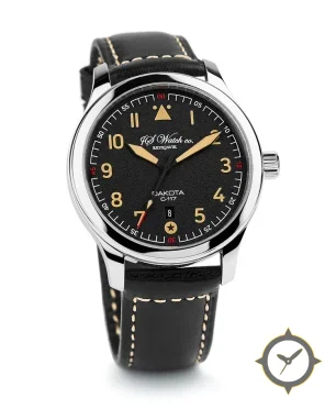Eine Pilot-Uhr mit einem vielseitigen 39.5mm Gehäuse, das an fast jedes Handgelenk passt, gefertigt aus Edelstahl mit einem Zifferblatt in schwarz und einer besonderen "matte grained"-Oberfläche.