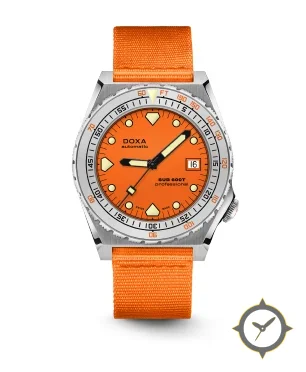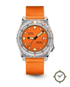 Eine Taucheruhr-Uhr mit einem 33mm Gehäuse im Vintage-Stil gefertigt aus Edelstahl mit einem Zifferblatt in orange und einer besonderen "matte"-Oberfläche.