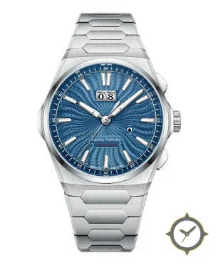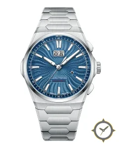 Eine Luxus-Uhr mit einem markanten 41.5mm Auftritt am Handgelenk, gefertigt aus Edelstahl mit einem Zifferblatt in blau und einer besonderen "spiral guilloche / engine-turned wave texture"-Oberfläche.