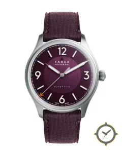 Eine Dress-Uhr mit einem markanten 41.5mm Auftritt am Handgelenk, gefertigt aus Edelstahl mit einem Zifferblatt in lila und einer besonderen "sunburst"-Oberfläche.