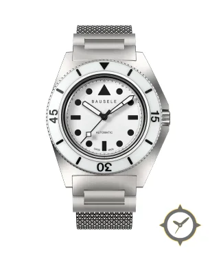 Eine Taucheruhr-Uhr mit einem markanten 44.5mm Auftritt am Handgelenk, gefertigt aus Edelstahl mit einem Zifferblatt in weiß und einer besonderen "matte"-Oberfläche.