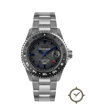 Eine -Uhr mit einem markanten 52mm Auftritt am Handgelenk, gefertigt aus Edelstahl mit einem Zifferblatt in grau und einer besonderen "wave pattern"-Oberfläche.