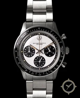 Eine Chronograph-Uhr gefertigt aus Edelstahl mit einem Zifferblatt in weiß und einer besonderen "matte"-Oberfläche.