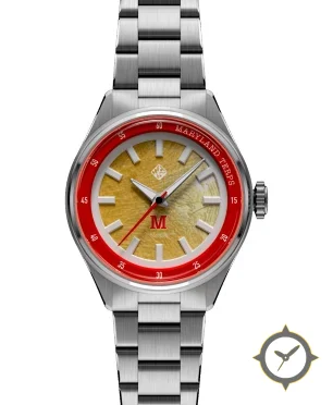 Eine Sport-Uhr mit einem markanten 45mm Auftritt am Handgelenk, gefertigt aus Edelstahl mit einem Zifferblatt in gold und einer besonderen "subtle textured/hammered finish"-Oberfläche.