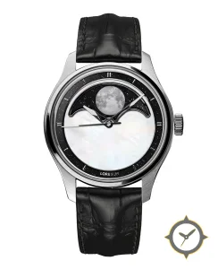 Eine Dress-Uhr mit einem markanten 45mm Auftritt am Handgelenk, gefertigt aus Edelstahl mit einem Zifferblatt in weiß und einer besonderen "mother-of-pearl"-Oberfläche und einer wunderschönen Mondphasenanzeige.