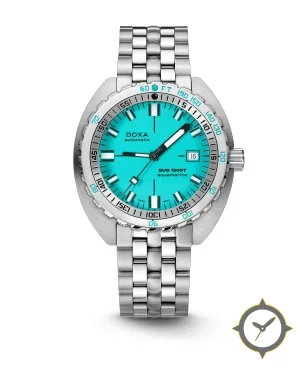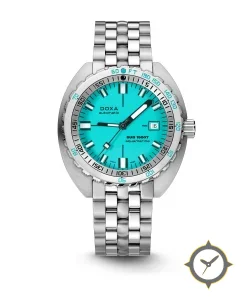 Eine Taucheruhr-Uhr mit einem markanten 49.5mm Auftritt am Handgelenk, gefertigt aus Edelstahl mit einem Zifferblatt in türkis und einer besonderen "smooth lacquer"-Oberfläche.