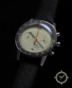 Eine Chronograph-Uhr mit einem 32mm Gehäuse im Vintage-Stil gefertigt aus Edelstahl mit einem Zifferblatt in grün und einer besonderen "smooth matte"-Oberfläche.