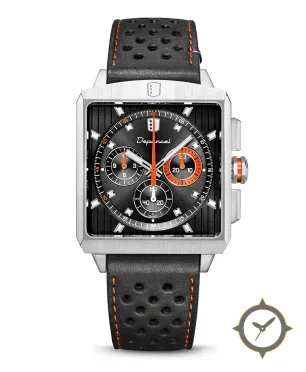 Eine Racing-Uhr mit einem markanten 42mm Auftritt am Handgelenk, gefertigt aus Edelstahl mit einem Zifferblatt in schwarz und einer besonderen "sunburst center with vertical ribbed panels"-Oberfläche.