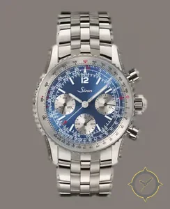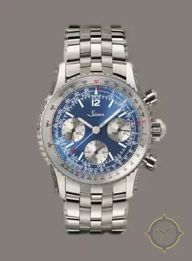 Eine Pilot-Uhr mit einem markanten 46.5mm Auftritt am Handgelenk, gefertigt aus Edelstahl mit einem Zifferblatt in blau und einer besonderen "sunburst"-Oberfläche.