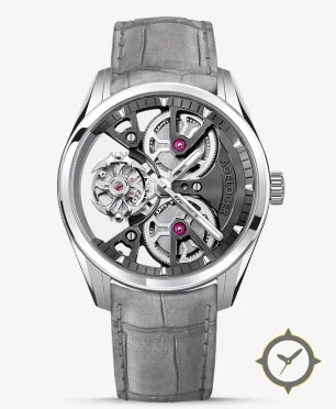 Eine Skelett-Uhr gefertigt aus Edelstahl mit einem Zifferblatt in grau und einer besonderen "open-worked skeleton with brushed metallic bridges"-Oberfläche.