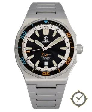 Eine Taucheruhr-Uhr mit einem markanten 47.5mm Auftritt am Handgelenk, gefertigt aus Edelstahl mit einem Zifferblatt in schwarz und einer besonderen "sunburst"-Oberfläche.