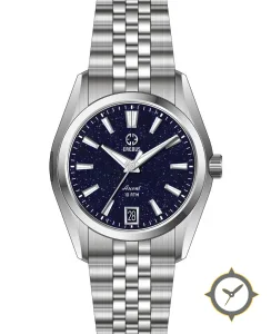 Eine Dress-Uhr mit einem 30mm Gehäuse im Vintage-Stil gefertigt aus Edelstahl mit einem Zifferblatt in marineblau und einer besonderen "aventurine (sparkling, star-field)"-Oberfläche.
