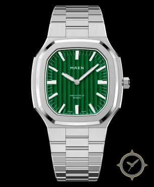 Eine Luxus-Uhr mit einem 34.5mm Gehäuse im Vintage-Stil gefertigt aus Edelstahl mit einem Zifferblatt in grün und einer besonderen "vertical guilloché / striped texture"-Oberfläche.