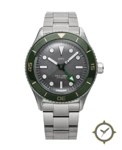 Eine Taucheruhr-Uhr mit einem markanten 46.5mm Auftritt am Handgelenk, gefertigt aus Edelstahl mit einem Zifferblatt in grau und einer besonderen "sunburst"-Oberfläche.