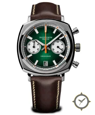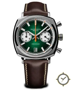 Eine Chronograph-Uhr mit einem markanten 49mm Auftritt am Handgelenk, gefertigt aus Edelstahl mit einem Zifferblatt in grün und einer besonderen "sunburst"-Oberfläche.