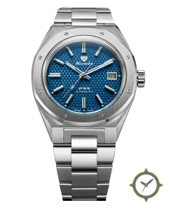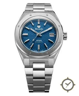Eine Sport-Uhr mit einem markanten 44mm Auftritt am Handgelenk, gefertigt aus Edelstahl mit einem Zifferblatt in blau und einer besonderen "tapisserie / waffle (woven basketweave)"-Oberfläche.