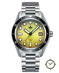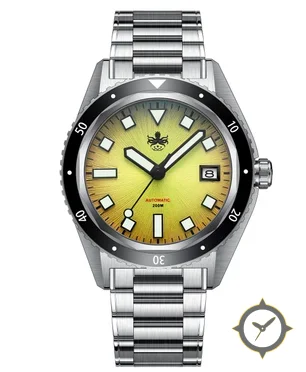Eine Taucheruhr-Uhr mit einem markanten 46.5mm Auftritt am Handgelenk, gefertigt aus Edelstahl mit einem Zifferblatt in gelb und einer besonderen "sunburst / radial"-Oberfläche.