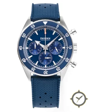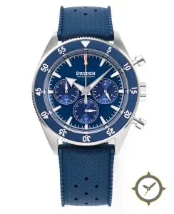 Eine Chronograph-Uhr mit einem markanten 43.5mm Auftritt am Handgelenk, gefertigt aus Edelstahl mit einem Zifferblatt in blau und einer besonderen "sunburst (radial)"-Oberfläche.