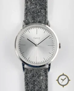 Eine Minimalistisch-Uhr mit einem vielseitigen 39.5mm Gehäuse, das an fast jedes Handgelenk passt, gefertigt aus Edelstahl mit einem Zifferblatt in silber und einer besonderen "sunburst"-Oberfläche.