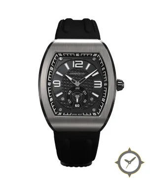 Eine Luxus-Uhr gefertigt aus Edelstahl mit einem Zifferblatt in schwarz und einer besonderen "carbon-fiber weave center with brushed outer ring"-Oberfläche.