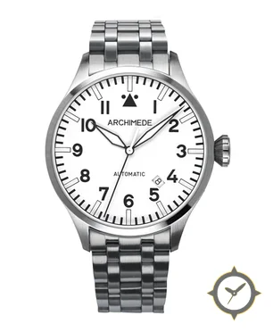 Eine Pilot-Uhr mit einem 34mm Gehäuse im Vintage-Stil gefertigt aus Edelstahl mit einem Zifferblatt in weiß und einer besonderen "matte"-Oberfläche.