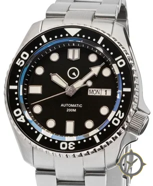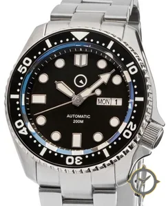 Eine Taucheruhr-Uhr mit einem markanten 50.5mm Auftritt am Handgelenk, gefertigt aus Edelstahl mit einem Zifferblatt in schwarz und einer besonderen "matte"-Oberfläche.