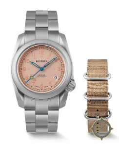 Eine Field-Uhr mit einem vielseitigen 38mm Gehäuse, das an fast jedes Handgelenk passt, gefertigt aus Titan mit einem Zifferblatt in orange und einer besonderen "matte"-Oberfläche.