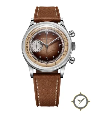 Eine Chronograph-Uhr mit einem 33mm Gehäuse im Vintage-Stil gefertigt aus Edelstahl mit einem Zifferblatt in braun und einer besonderen "gradient sunburst with wavy/wood-grain texture"-Oberfläche.