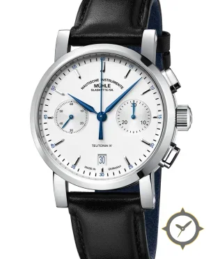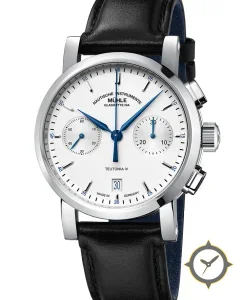 Eine Chronograph-Uhr mit einem 34mm Gehäuse im Vintage-Stil gefertigt aus Edelstahl mit einem Zifferblatt in weiß und einer besonderen "matte"-Oberfläche.