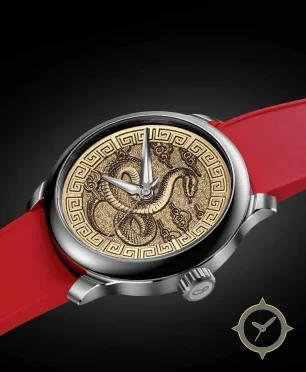 Eine Luxus-Uhr mit einem markanten 47mm Auftritt am Handgelenk, gefertigt aus Edelstahl mit einem Zifferblatt in gold und einer besonderen "engraved / bas-relief (high-relief serpent motif)"-Oberfläche.
