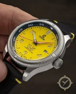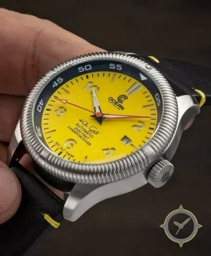 Eine Taucheruhr-Uhr mit einem markanten 51mm Auftritt am Handgelenk, gefertigt aus Edelstahl mit einem Zifferblatt in gelb und einer besonderen "matte"-Oberfläche.