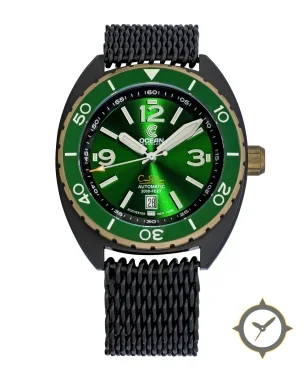 Eine Taucheruhr-Uhr mit einem markanten 52mm Auftritt am Handgelenk, gefertigt aus Edelstahl mit einem Zifferblatt in grün und einer besonderen "sunburst"-Oberfläche.