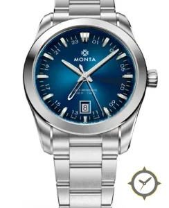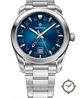 Eine -Uhr mit einem vielseitigen 38.5mm Gehäuse, das an fast jedes Handgelenk passt, gefertigt aus Edelstahl mit einem Zifferblatt in blau und einer besonderen "sunburst / gradient"-Oberfläche.