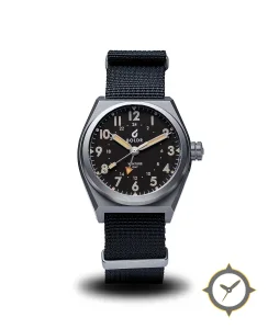 Eine GMT-Uhr mit einem 35mm Gehäuse im Vintage-Stil gefertigt aus Titan mit einem Zifferblatt in schwarz und einer besonderen "matte"-Oberfläche und einer echten GMT-Funktion, mit der du eine zweite Zeitzone verfolgen kannst.