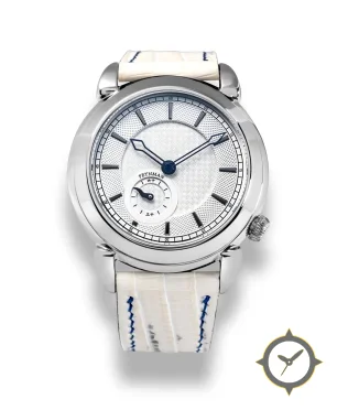 Eine Dress-Uhr mit einem markanten 44.5mm Auftritt am Handgelenk, gefertigt aus Edelstahl mit einem Zifferblatt in weiß und einer besonderen "engine-turned guilloche"-Oberfläche.