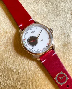 Eine Dress-Uhr mit einem 35mm Gehäuse im Vintage-Stil gefertigt aus Gold mit einem Zifferblatt in weiß und einer besonderen "lacquer (smooth)"-Oberfläche.
