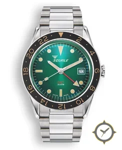 Eine GMT-Uhr mit einem markanten 42.5mm Auftritt am Handgelenk, gefertigt aus Edelstahl mit einem Zifferblatt in grün und einer besonderen "sunburst/gradient"-Oberfläche und einer echten GMT-Funktion, mit der du eine zweite Zeitzone verfolgen kannst.