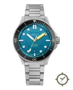 Eine Taucheruhr-Uhr mit einem markanten 46mm Auftritt am Handgelenk, gefertigt aus Edelstahl mit einem Zifferblatt in türkis und einer besonderen "brushed"-Oberfläche.