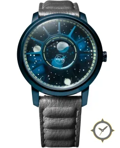 Eine Dress-Uhr mit einem 33.5mm Gehäuse im Vintage-Stil gefertigt aus Edelstahl mit einem Zifferblatt in blau und einer besonderen "starry/space-themed with radial spokes"-Oberfläche und einer wunderschönen Mondphasenanzeige.