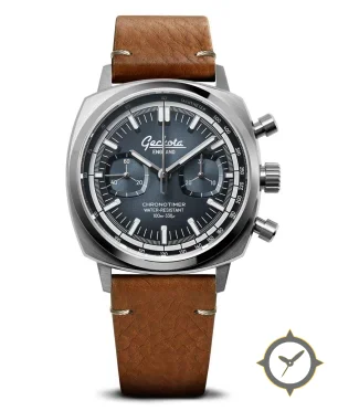 Eine Chronograph-Uhr mit einem 35.5mm Gehäuse im Vintage-Stil gefertigt aus Edelstahl mit einem Zifferblatt in blau und einer besonderen "sunburst (metallic gradient)"-Oberfläche.
